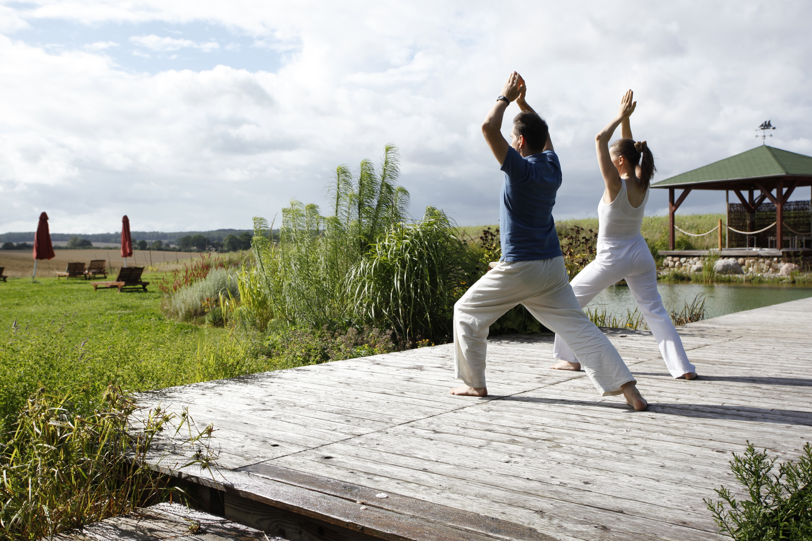 Inmitten der großen Felder am Ufer des Naturbadeteichs und direkt neben dem TAO Gesundheitszentrum steht unser schwedenrotes Saunahaus. Es beherbergt drei Saunen (1 Biosauna mit Dampf bis ca. 60°, 1 Finnische Sauna, trocken, bis ca. 90°, 1 Tecaldarium bis ca. 45°), viele Wärmebänke, einen Licht durchfluteten Ruheraum und ein Bistro, in dem Getränke und kleine Speisen gereicht werden. Im Außenbereich laden zwei Whirlpools zu einem warmen Bad in jeder Jahreszeit.